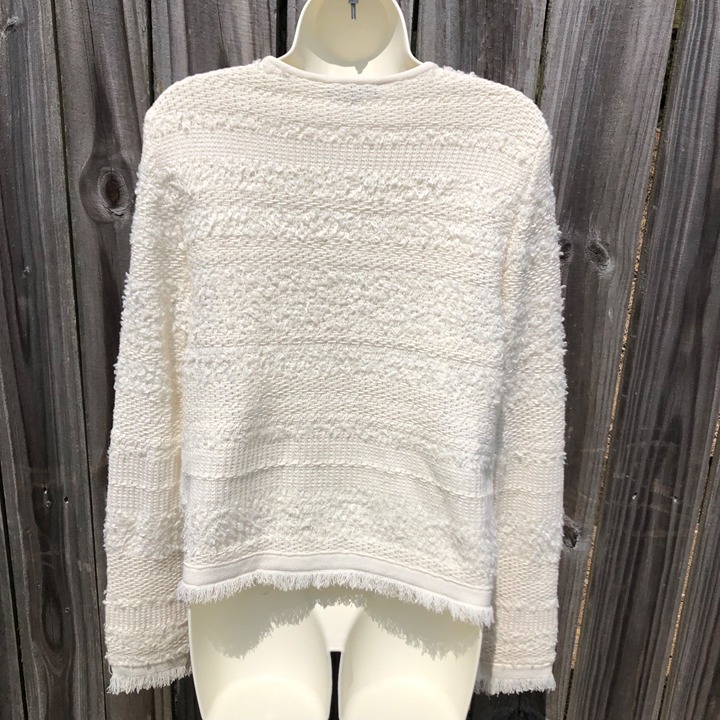 Ann Taylor NWT Cardigan Jacket with pearl buttons. Ivory color. Features full length sleeves and a round neckline. Horizontal texture. Button down front. Raw trim/fringe detail. 60% cotton, 22% Acrylic, 14% Nylon, 1% Wool, 3% other. Machine Wash Cold. New with tags. Size medium.