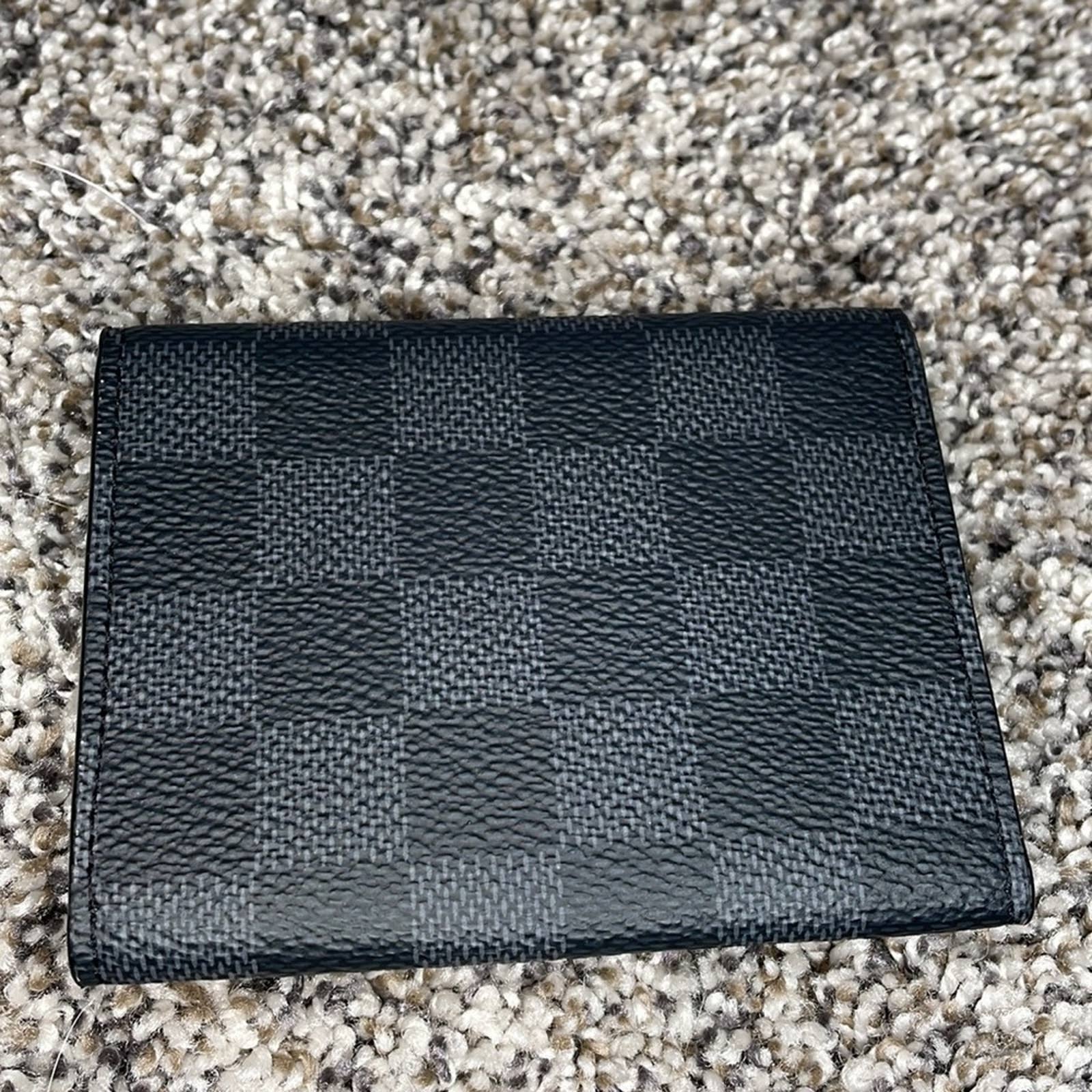 Authentic Louis Vuitton, Damier graphite, card case and overall excellent preowned condition. I don’t see any visible wear on the item, but please note this item was hot stamped, and the initials have since been removed. But that is the only flaw. Not very visible, but please see the photos. This item snaps closed in the snap works well. it includes four sections for cards and other items.