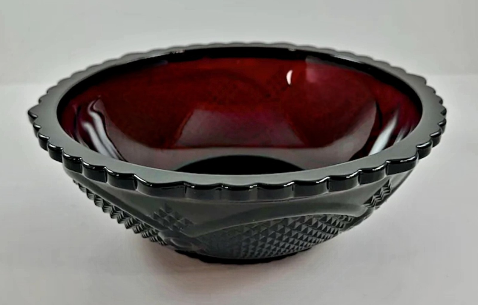 This VTG Avon Red Serving Bowl 9" w x 3" t from The 1876 Cape Cod Collection is a beautiful and ornate piece made of glass. With a glossy finish and a vibrant red color, it adds a touch of elegance to any room. This original vintage vase, manufactured in the United States in the 1980s, is perfect for all occasions and stands at 9" wide x 3 inches tall, making it a striking decorative collectible for any home. Remember to handwash to maintain its beauty for years to come. In MINT CONDITION. No cracks or chips.