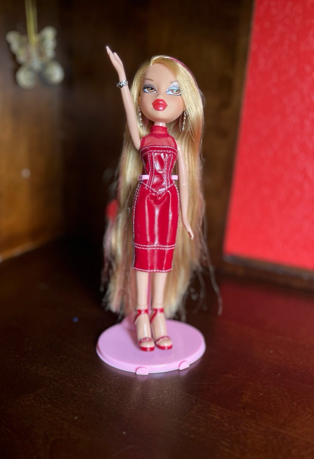 Bratz Magic Hair Color Leah has been on display and storage. Please note in photo #6, you can see that her dress is starting to peel. I just noticed it when I was taking her photos. Her long beautiful long hair covers it. In photo#8, she has a tiny dot on her foot. Her hair is very soft. She comes with no accessories and no stand. Her face is perfect with no flaws. Sold as is. No returns.