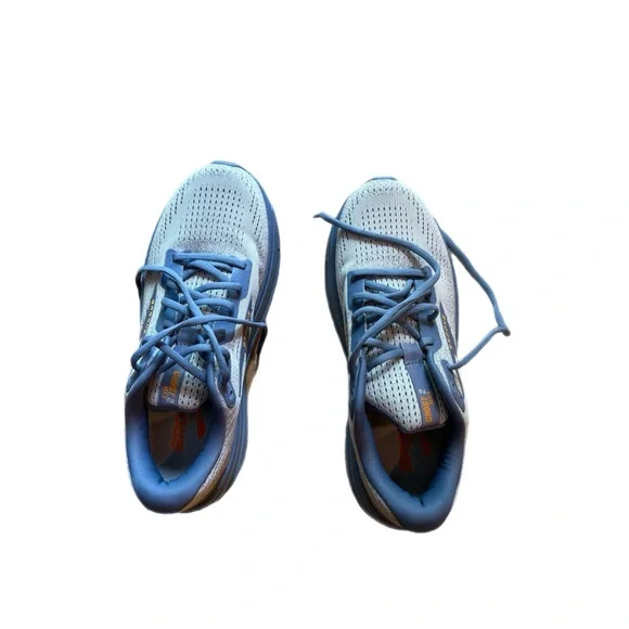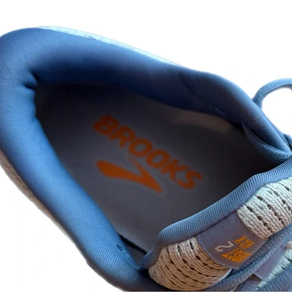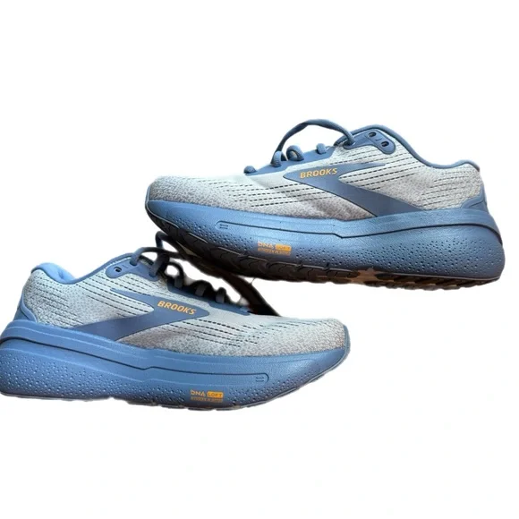 Stylish Brooks running shoes in the following color: 119 - Oyster Mushroom/Blue/Orange. From the website: Soft, smooth, and protective, the Ghost Max 2 men's road-running shoes deliver maximum comfort for running or walking. With lots of soft, lightweight cushioning, a rocker shape that actively helps you move from landing to toe-off, and a broad base for added stability, the Ghost Max 2 is ready to roll.Comes from a smoke-free home. Only worn twice inside home, have not been outside. In perfect condition, just got the wrong size and ran out of time to send back.