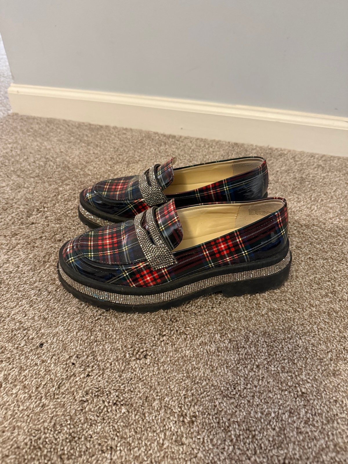 Jessica Simpson red & black plaid loafers with rhinestones. Perfect for the holidays or just when you want some bling. Great statement piece. In excellent condition. True to size. Only worn a few times. Comes with the original box. Size 8