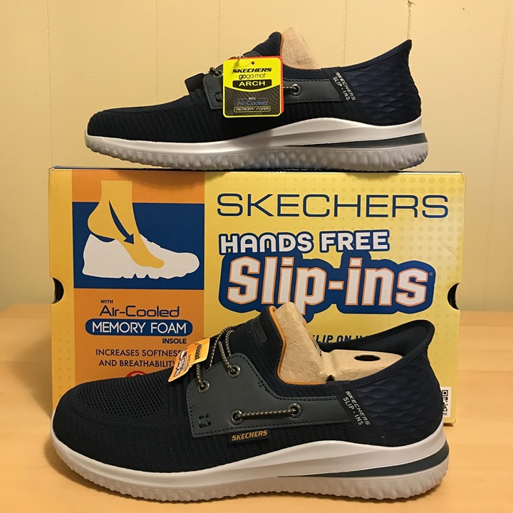 Go Hands Free™ Simply step in and go wearing Skechers Hands Free Slip-ins®: Delson 3.0 - Roth. Designed with our Heel Pillow®, this slip-on boat style features an engineered knit and synthetic upper with stretch laces, a Skechers Air-Cooled Memory Foam® comfort insole, and Goga Mat Arch™ cushioning for added support.