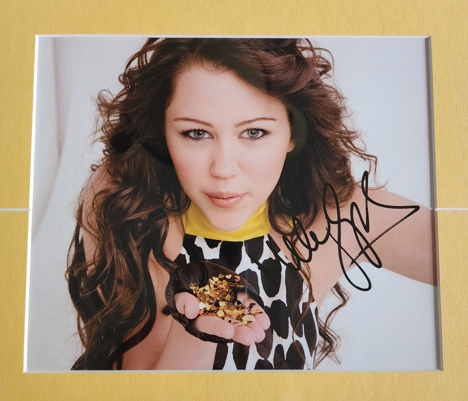 Custom frame measures approximately 22" x 36" in size and features a photo that has been hand-signed by Miley Cyrus. Please note the frame also includes (1) additional photo. The autograph includes an official James Spence Authentication (JSA) hologram for authenticity purposes. Please note this is her old signature and not nearly as common as her new autograph which is a scribble and a smiley face.