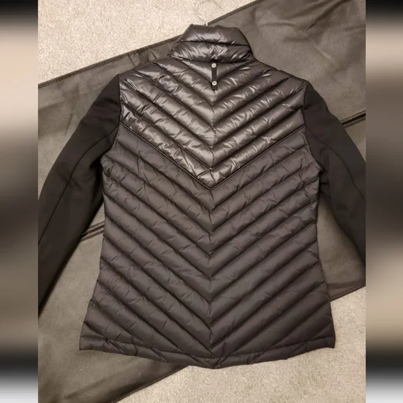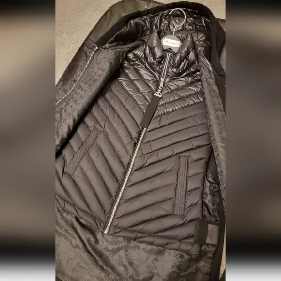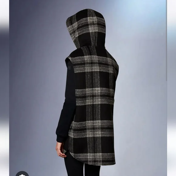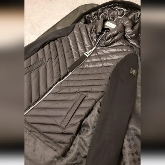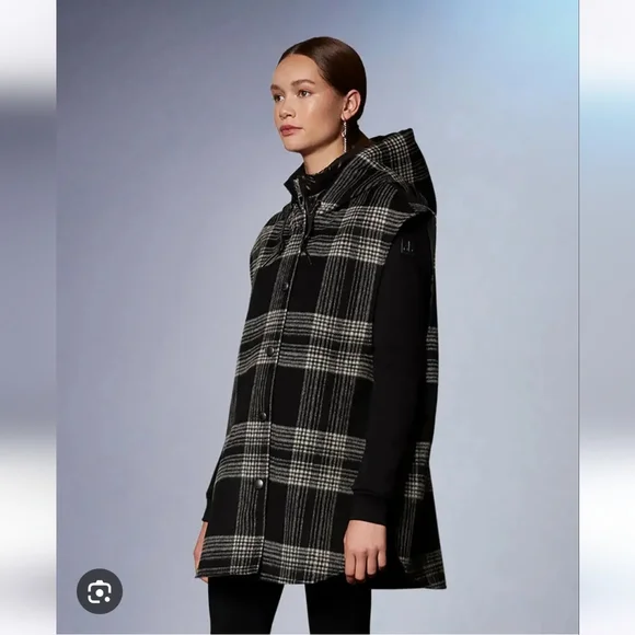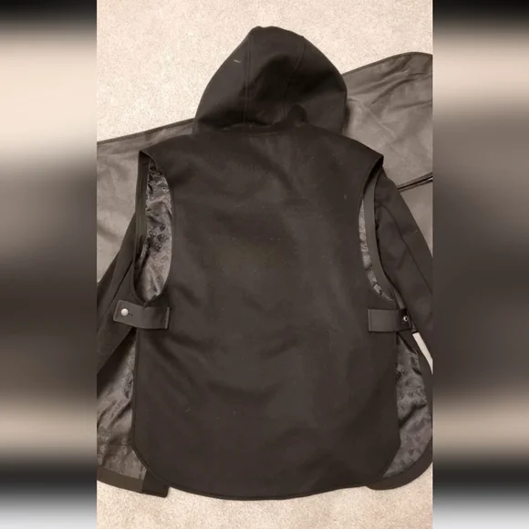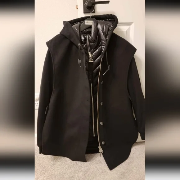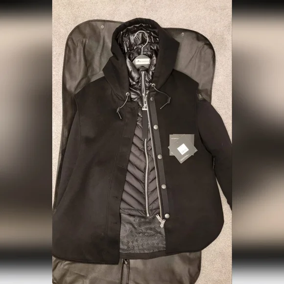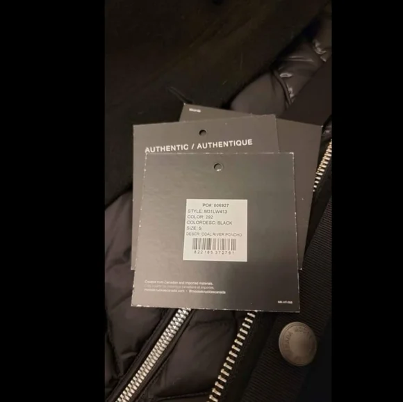 Moose Knuckles Coal River Jacket + Poncho, small, black.Condition: Brand new. Tags cut off but never worn. No defects. The version I'm selling is plain black Poncho, not plaid as shown on model. Plain black is sold out. These 2 separate pieces can be worn together or on their own. Inner jacket is a down jacket and outer Poncho is made out of cashmere blend.Unlike any poncho you've ever seen, the Coal River Poncho comes in a unique three-in-one construction: A nylon inner jacket with toasty RDS (responsible down standard) certified 800 FP 90/10 down, and a cashmere blend outer.Stand collarLong sleevesZip front with button placketWaist zip pocketsThree-in-one construction800 fill powerJacket: Nylon/cottonPoncho: Wool/cashmere/other fibers/mohair/polyesterLining: PolyesterFill: 90% down/10% feathersDry cleanSIZE & FITRelaxed fitAbout 33" from shoulder to hem