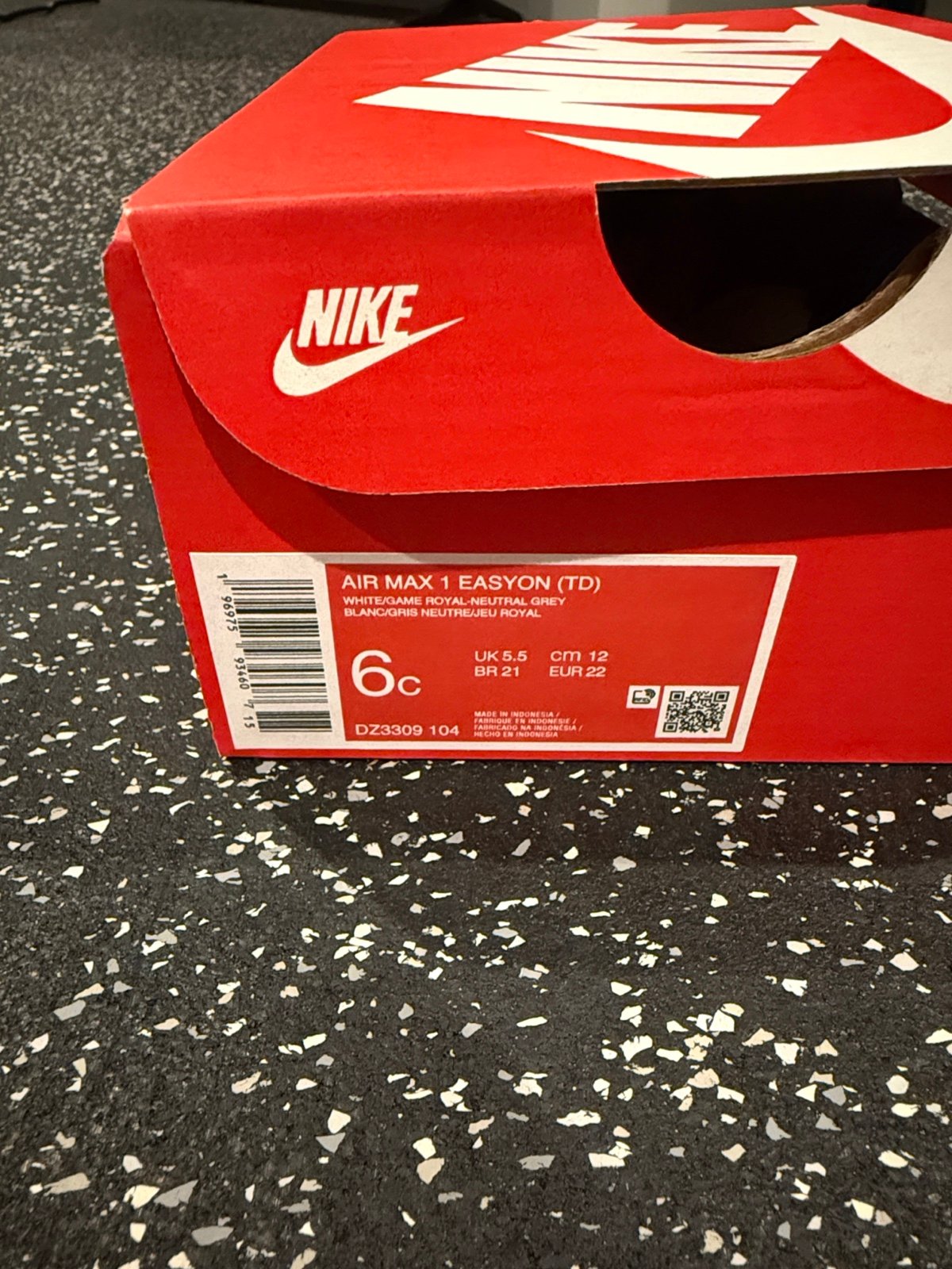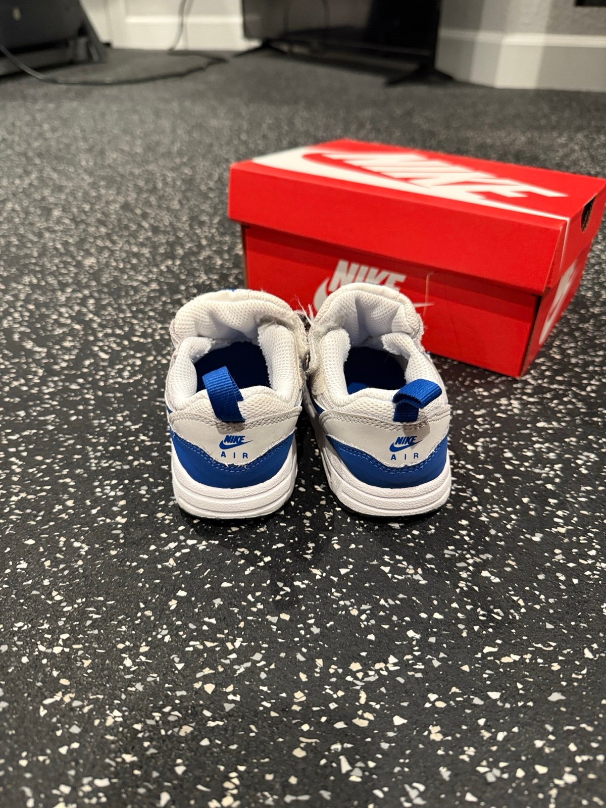 Charming Nike sneakers for infants. Blue and white design. Comfortable and stylish. Have been worn but still in overall good condition. Comes with original box.