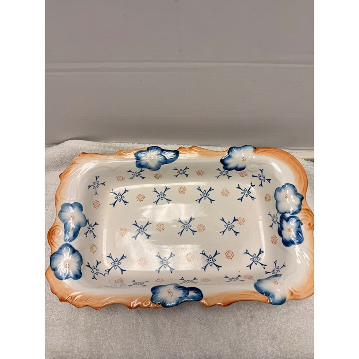 This charming stoneware baking dish features an intricate blue floral pattern accented with warm orange tones. A delightful blend of elegance and functionality, it's a timeless addition to any kitchen, evoking a sense of nostalgia and heritage in every use. Perfect for showcasing your culinary creations in style.