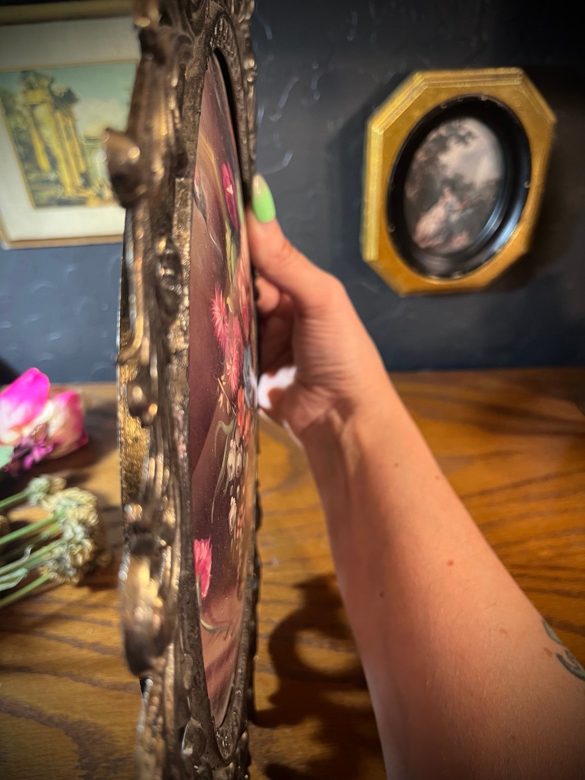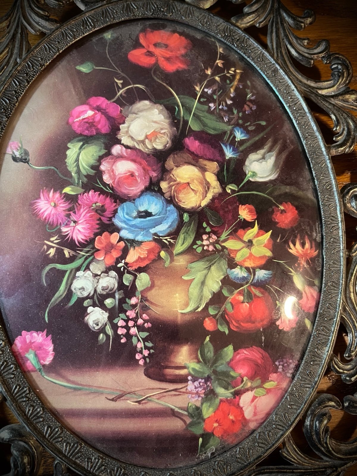 Beautiful large metal brass ornate filigree convex bubble glass Italian frame with flowers floral artwork. In great condition.