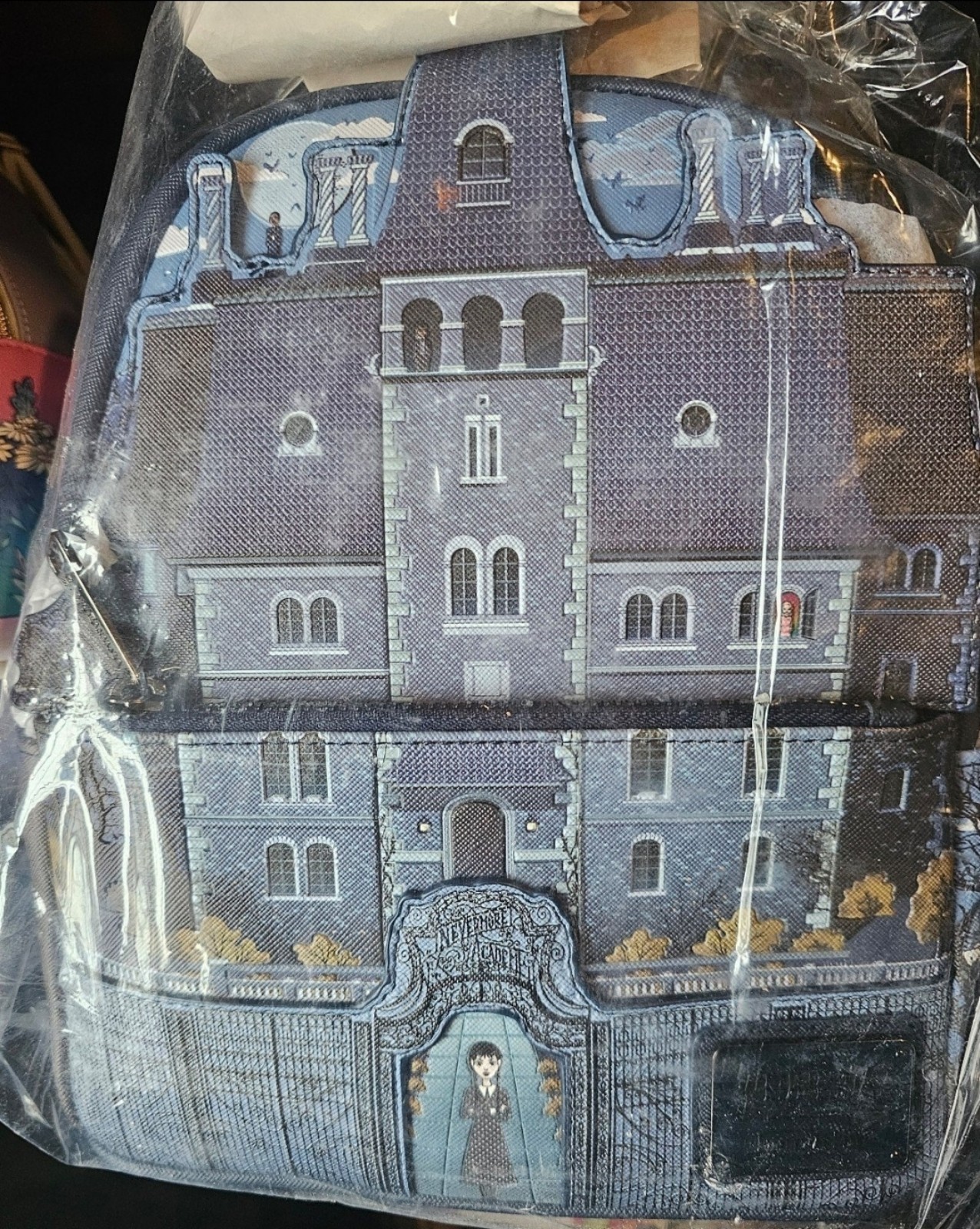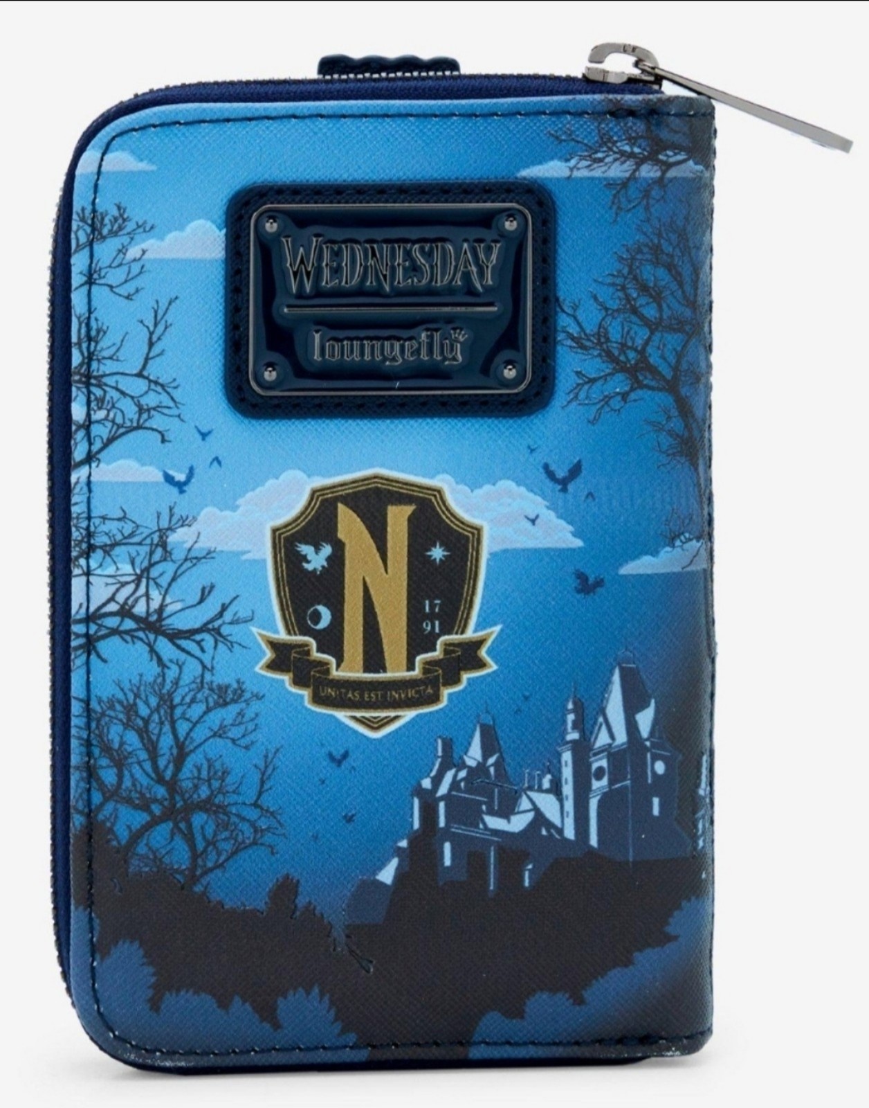 Nevermore Academy on the front, this wallet includes glow-in-the-dark details. With four card slots, a clear ID sleeve, and a zippered pouch, this accessory is perfect for fans of the series. Don't forget the matching mini backpack sold separately!