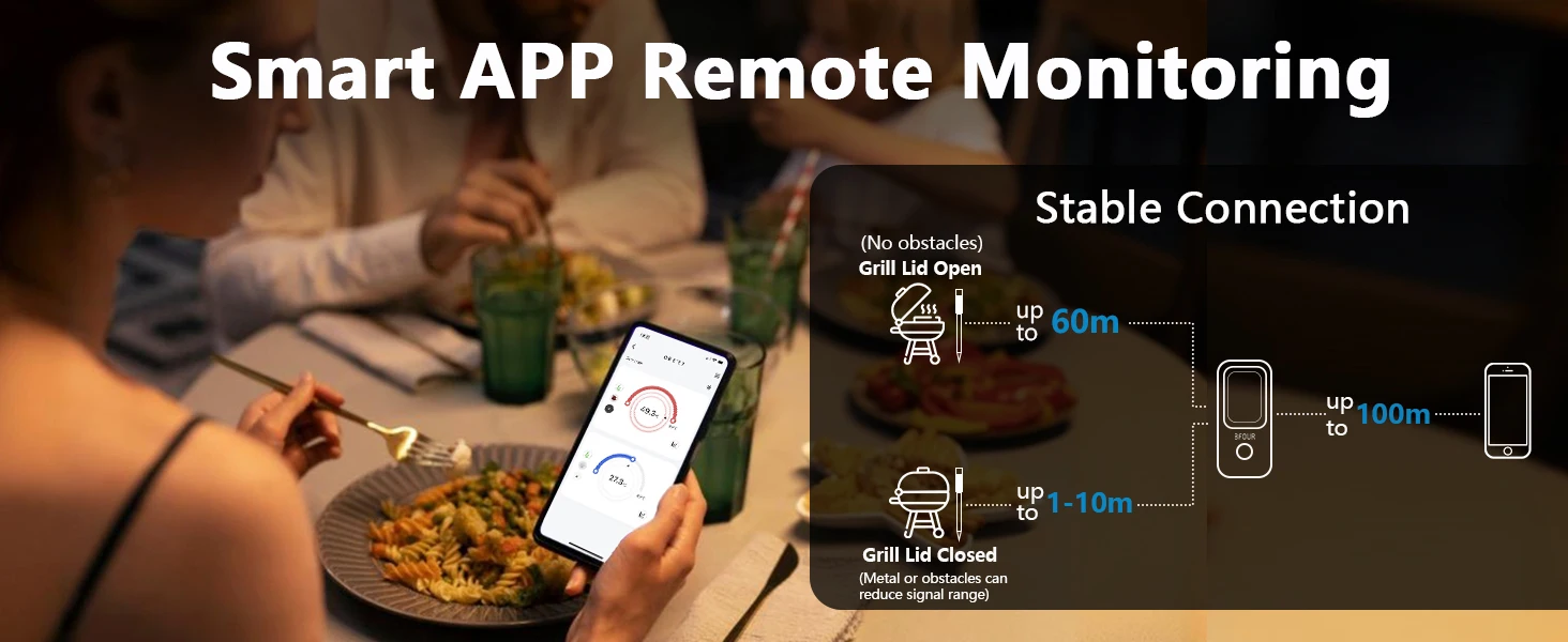 When the probe is used in a non-enclosed metal oven, our meat thermometer has an impressive wireless range of up to 70 m (200 ft), ensuring a reliable connection even at distances.